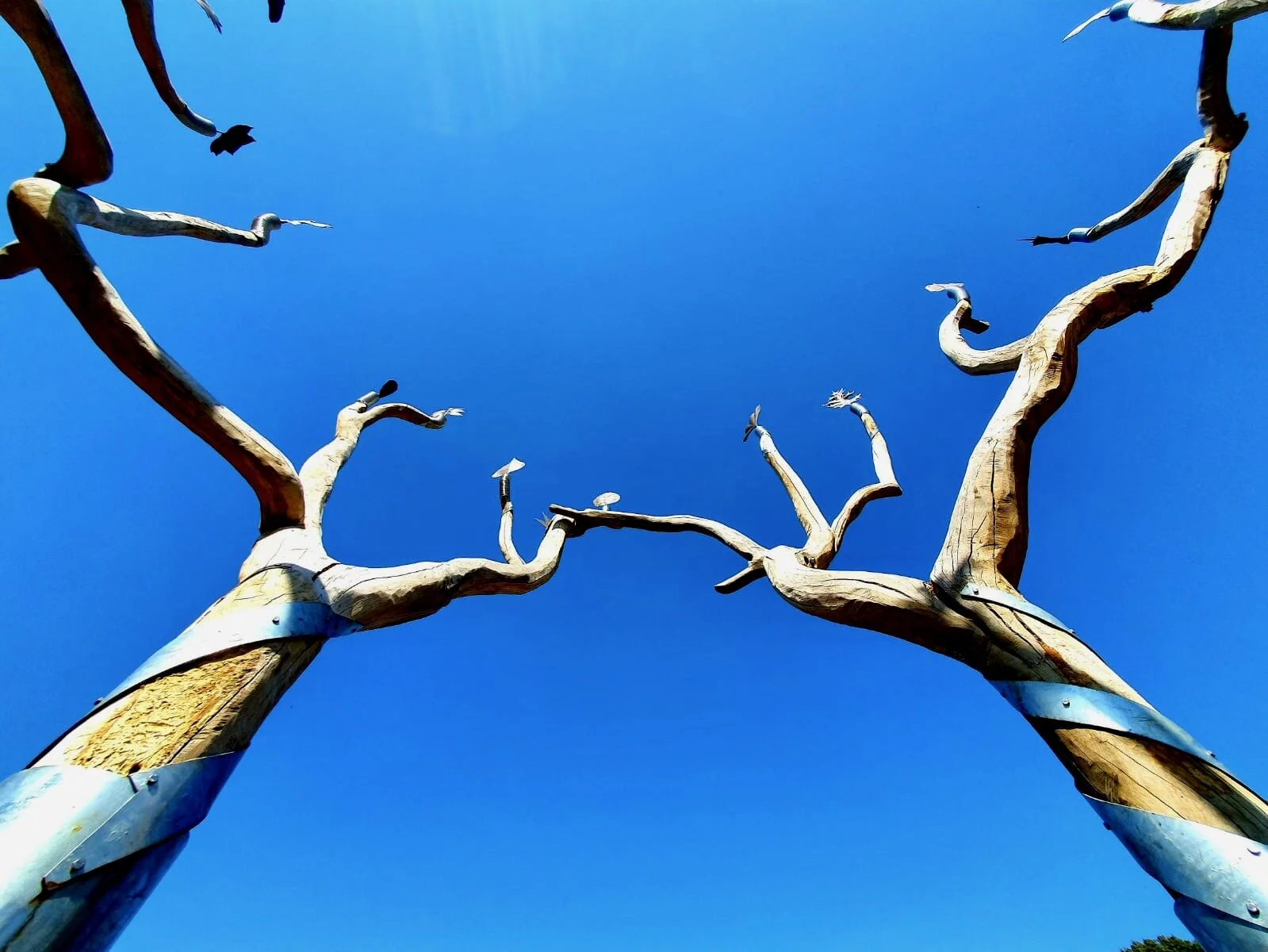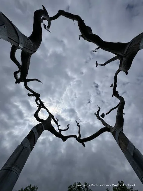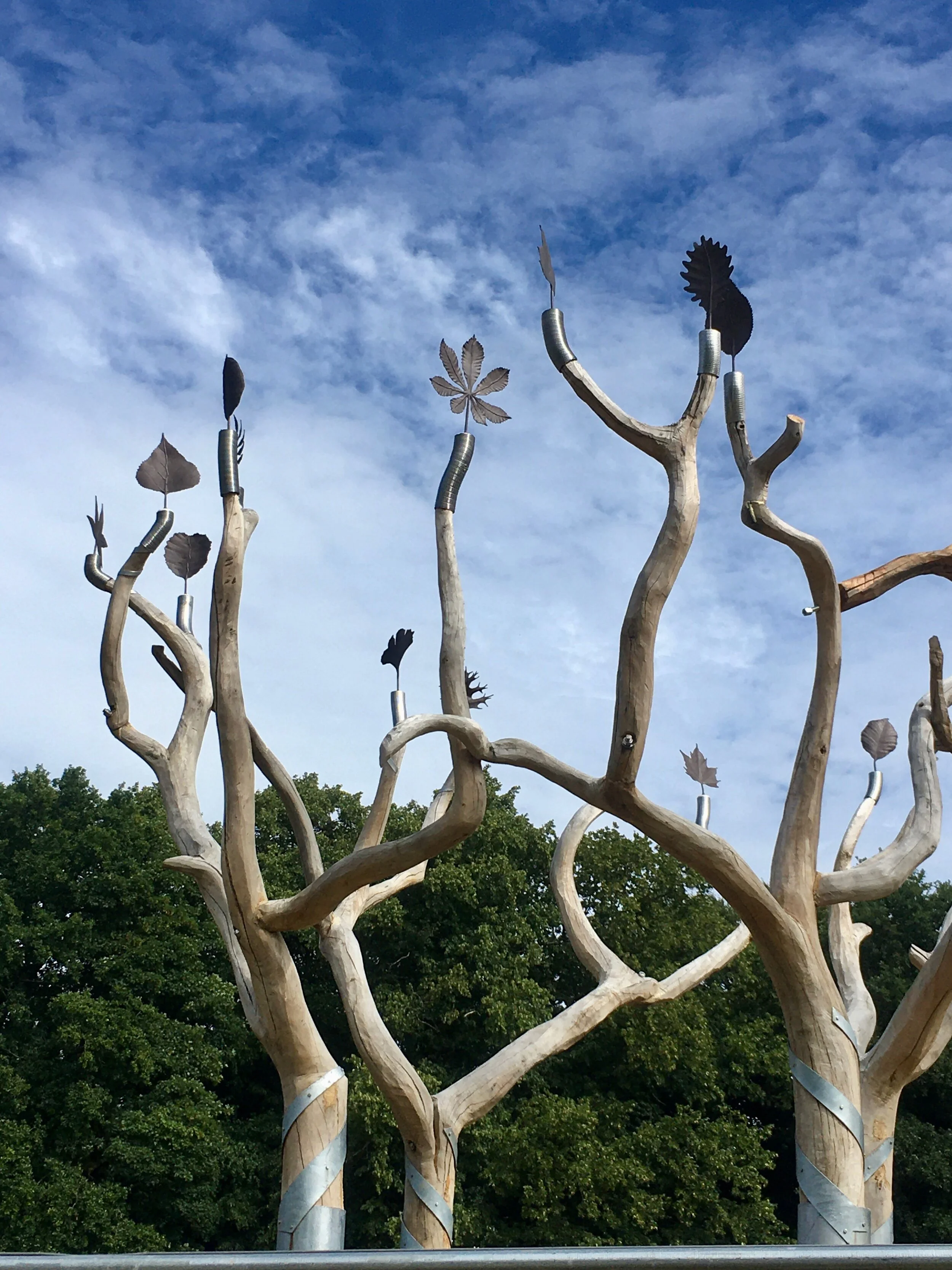 The sculpture uses the natural form of oak branches, carved and shaped to fit with forged, fabricated steel. The artists created four tree forms that have extended roots on the ground in steel, which can be used as seats. The inner area provides a meeting point with paths leading in and out. The combination of hot dipped galvanised mild steel and oak wood is dramatic and stunning in the park setting.
