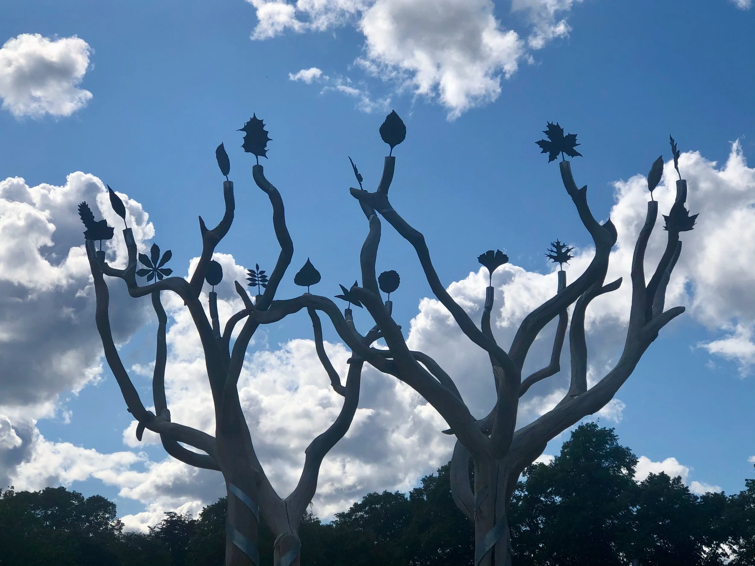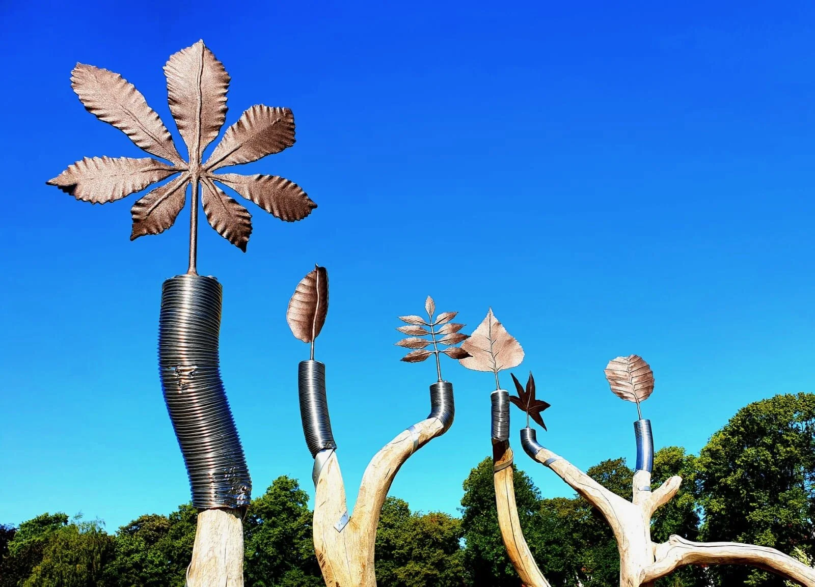 The detail of the design and choice of finials that crown the sculpture were developed through community workshops held in Handsworth Park during 2019. The metal leaves represent the many different trees in the park reflecting the different cultures and communities who use the park. The surfacing roots rise and fall, tracing the outer edges of the globe towards the four steel trunks - the four corners of the world. The oak is strong but flexes and twists in and out weaving together. This represents the community that becomes one great family.